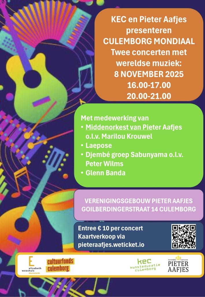 Na het grote succes van voorgaande jaren, organiseren Muziekschool KEC en Koninklijke Harmonie Pieter Aafjes op 8 november weer een multicultureel uitwisselingsconcert in de reeks Culemborg Mondiaal. Deze derde editie wordt samengewerkt tussen het Middenorkest van Pieter Aafjes onder leiding van Marilou Krouwel, de Molukse band Laepose, de Zambiaanse gitarist Glenn Banda en de djembégroep Sabunyama onder leiding van Peter Wilms. Het concert zal plaatvinden in het verenigingsgebouw van Pieter Aafjes aan de Goilberdingerstraat 14 en wordt op 8 november 2 keer uitgevoerd: een matinee van 16:00-17:00 uur en een avonduitvoering van 20:00-21:00 uur. Na afloop is er gelegenheid voor een hapje en een drankje.